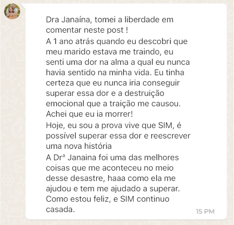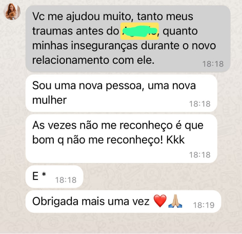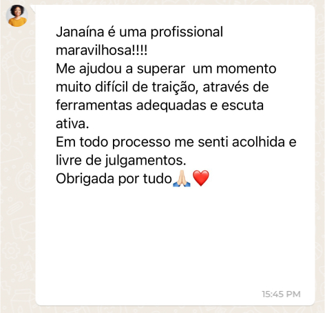 Sou psicóloga, graduada em Psicologia pela Universidade Federal de Juiz de Fora (UFJF), CRP: 05|46981. Pós-graduada em Terapia Cognitivo-Comportamental pelo Núcleo de Estudos Interdisciplinares em Saúde Mental (NEISME). Terapeuta de Casais e Relacionamentos, especializada em ajudar casais a superarem desafios e construir relações mais saudáveis e felizes.